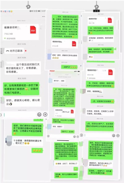 顾问单位负责人收到我所发送材料后均第一时间给予宝贵的回馈,对我所律师在疫情期间,还能坚持为客户服务的精神点赞,并对我所向客户发送的系列《法律风险及应对建议书》在企业战“疫”期间的价值和意义给予高度肯定。相关企业还在领导班子与成员的微信群内进行分享。