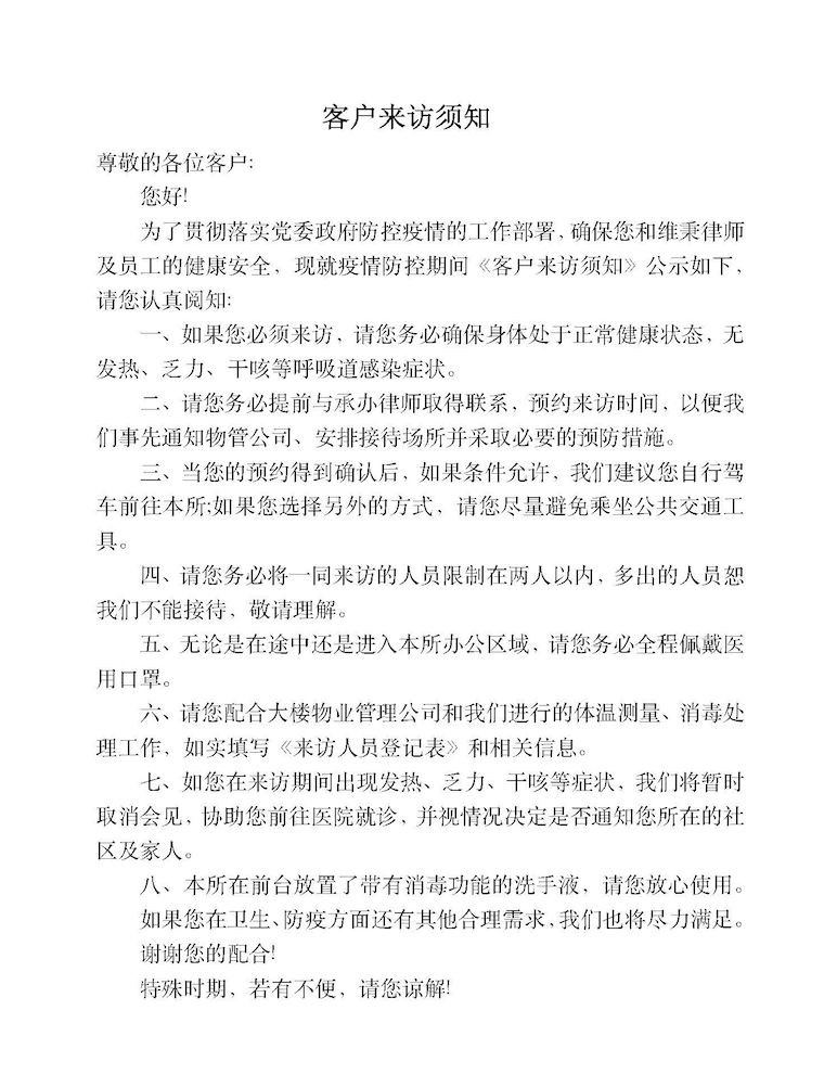 6、疫情期间律所设置客户接待区,来访客户须提前预约并配合登记检查。